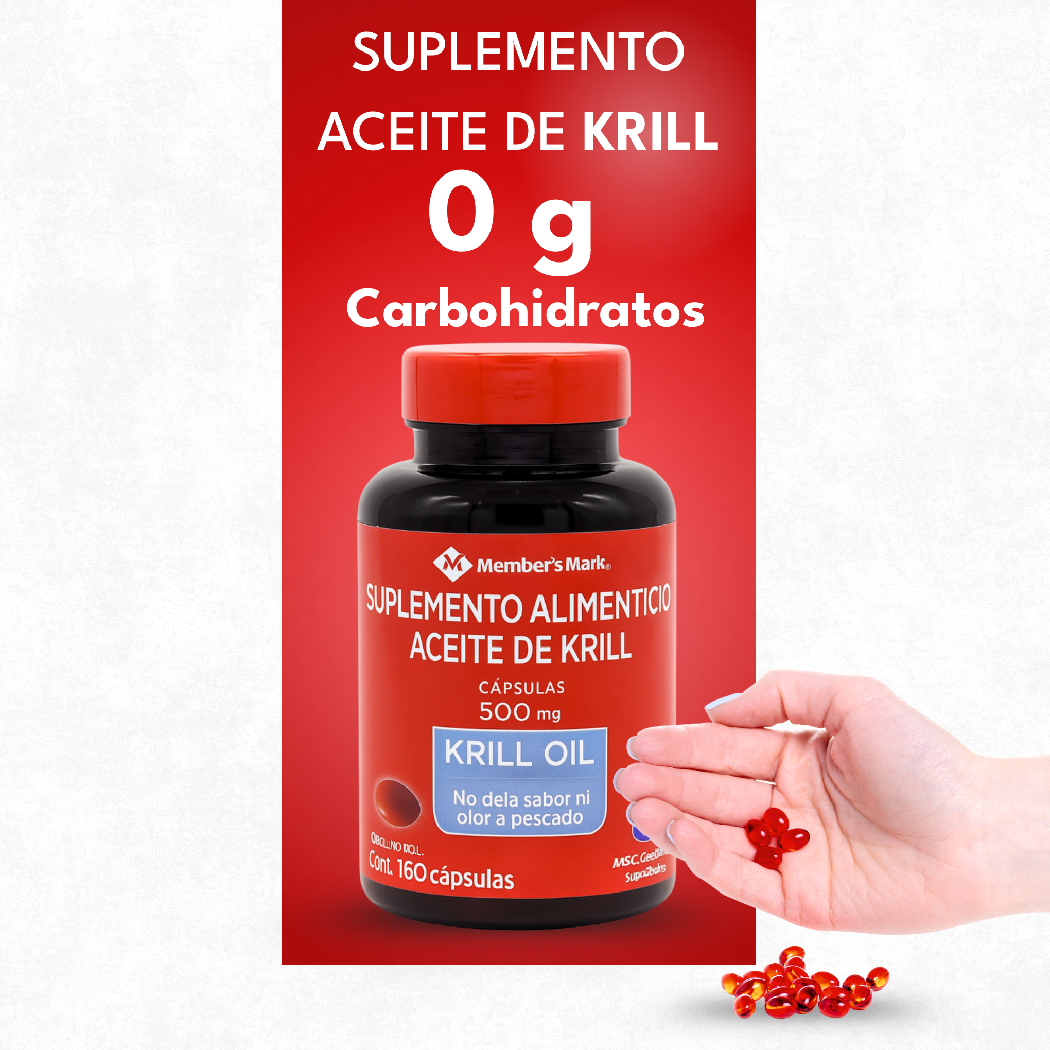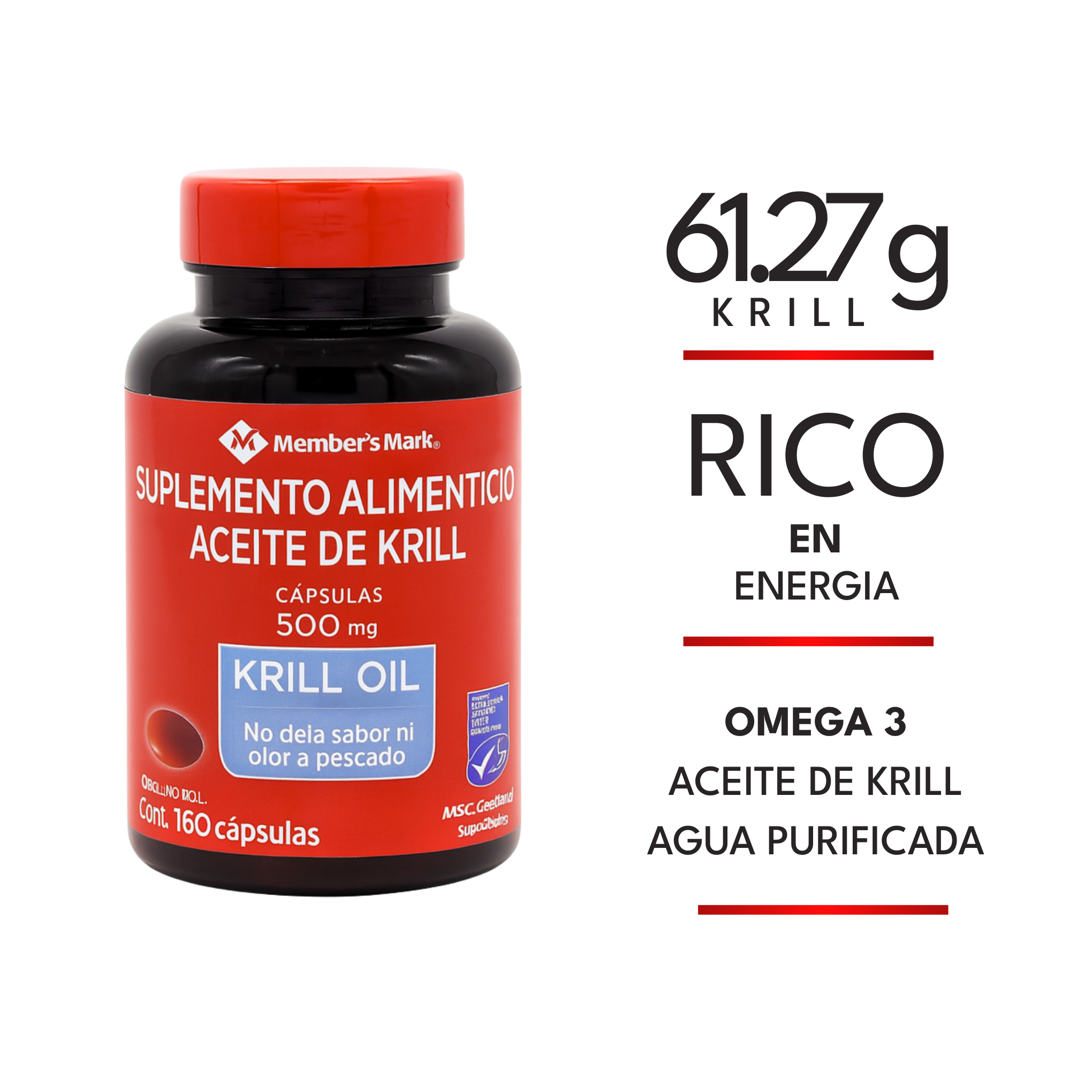 El aceite de krill Member's Mark contiene ácidos grasos omega-3 DHA y EPA. Investigaciones de apoyo, pero no concluyentes, muestran que el consumo de ácidos grasos omega-3 EPA y DHA puede reducir el riesgo de enfermedad coronaria.