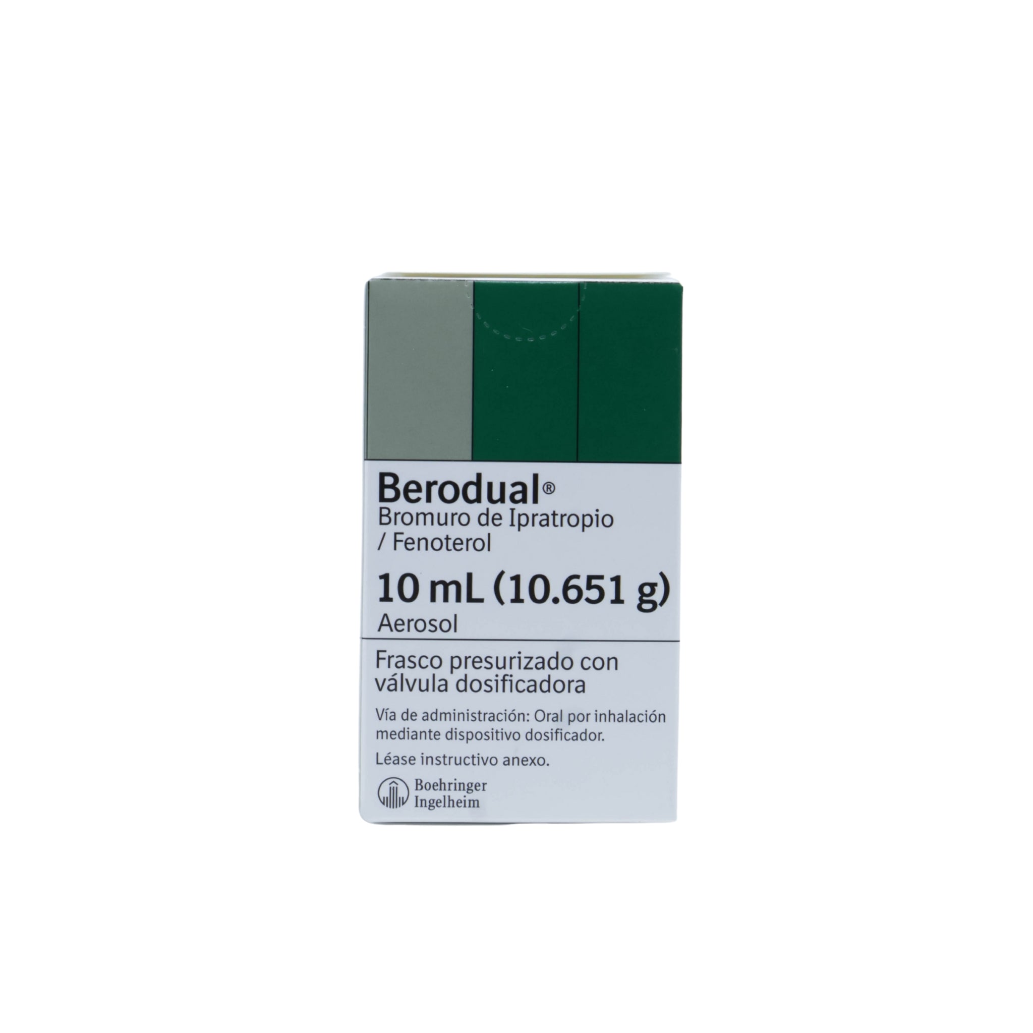 Berodual Bromuro de Ipratropio/Fenoterol 10 mL (10.651 g) es un medicamento broncodilatador inhalado que ayuda a mejorar la respiración en personas con asma, enfermedad pulmonar obstructiva crónica (EPOC), bronquitis crónica y enfisema pulmonar.