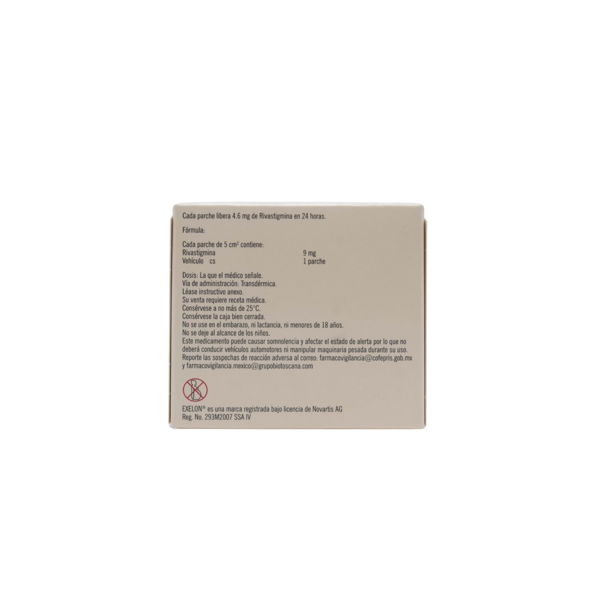 Fabricado por Laboratorios GBT, Exelon 9 mg parche transdérmico cuenta con registro sanitario 293M2007 SSA-IV, garantizando su seguridad, eficacia y cumplimiento con las normas sanitarias mexicanas.