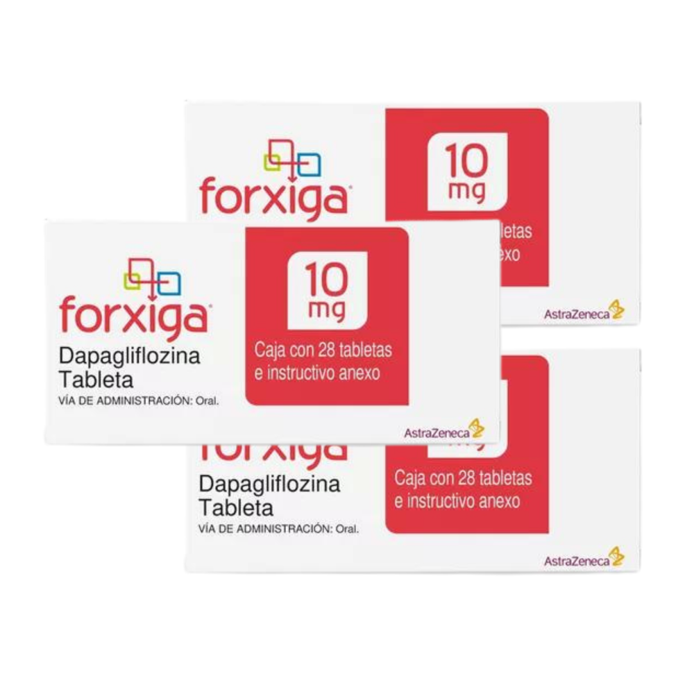 Incluye 3 cajas de Forxiga 10 mg, cada una con 28 tabletas, sumando un total de 84 tabletas. Es ideal para tratamiento continuo de hasta 3 meses.