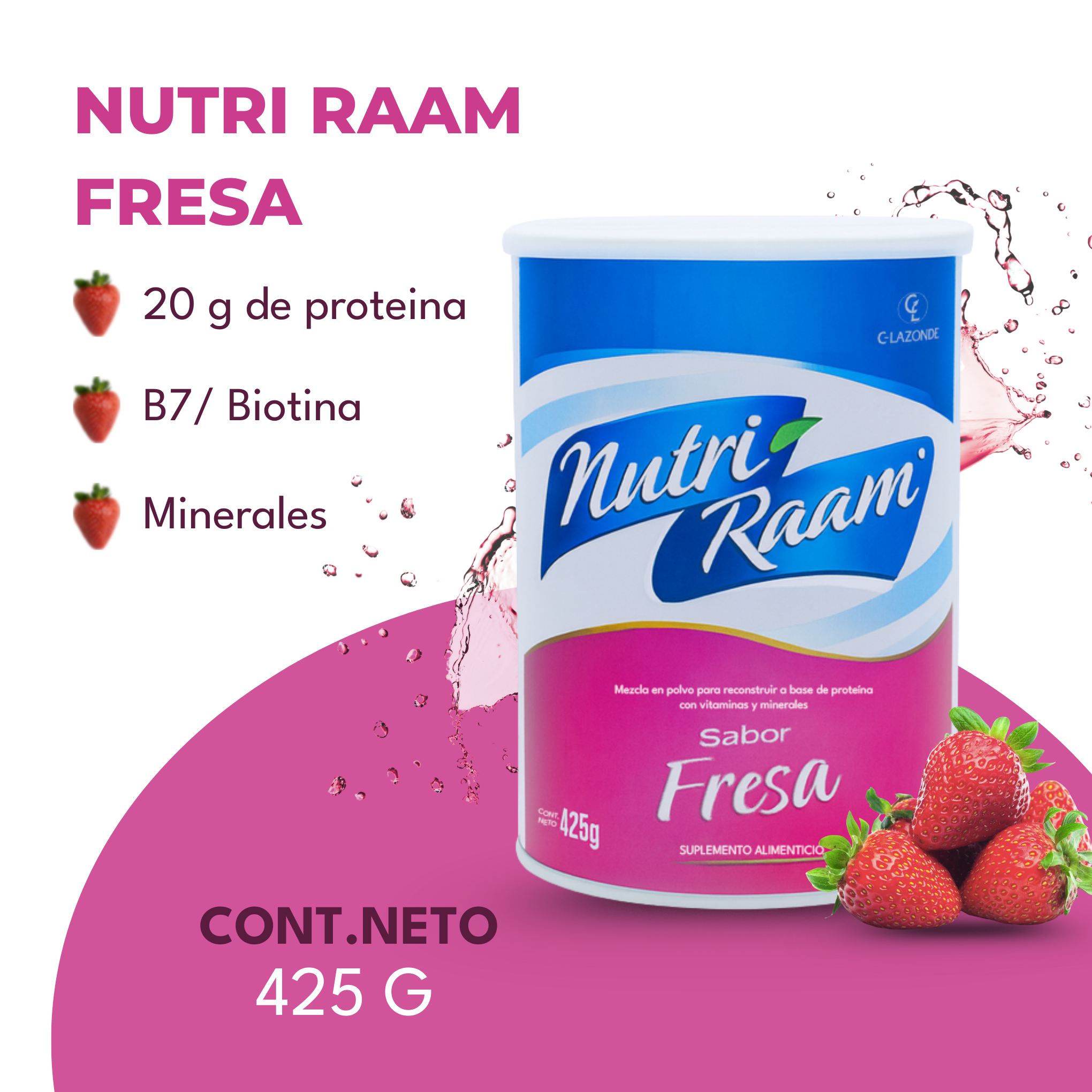 Nutri Raam Fresa ofrece una fórmula equilibrada con proteína, vitaminas, minerales y coenzimas: