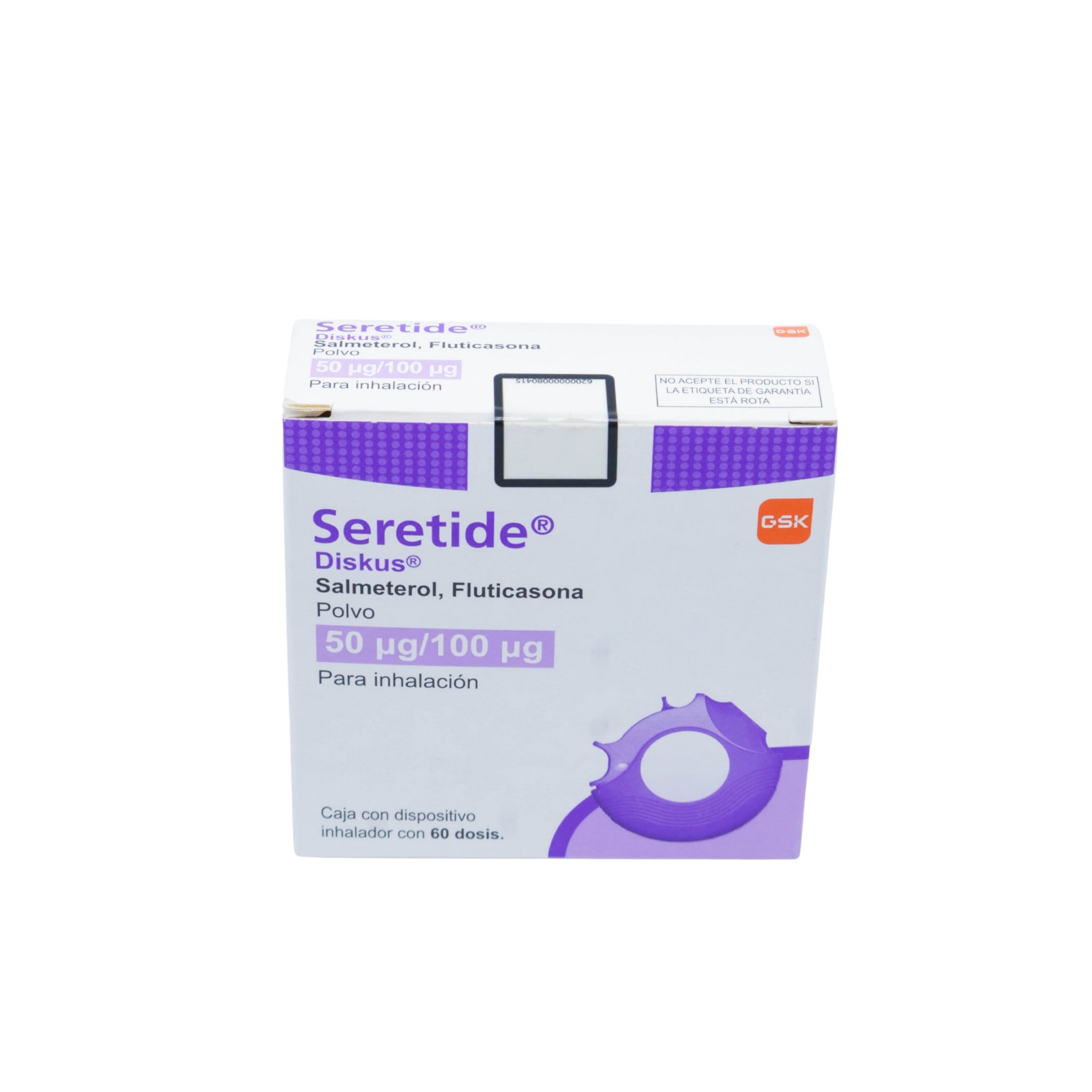 Este medicamento actúa de forma dual: relaja los músculos de las vías respiratorias y disminuye la hinchazón en los pulmones, lo cual mejora la función respiratoria y reduce la frecuencia de las crisis asmáticas. Seretide Diskus 50/100 viene en una caja con un dispositivo inhalador que contiene 60 dosis en polvo, diseñado para una administración sencilla y eficaz.